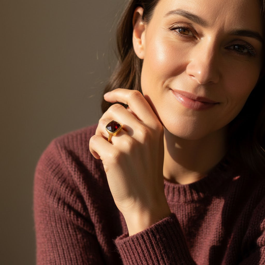 Bold yet refined, this garnet cushion cut ring captures the deep red brilliance of January’s birthstone in a timeless bezel setting. Designed for effortless elegance, this minimalist gemstone ring is perfect for stacking, gifting, or wearing as a signature everyday piece.