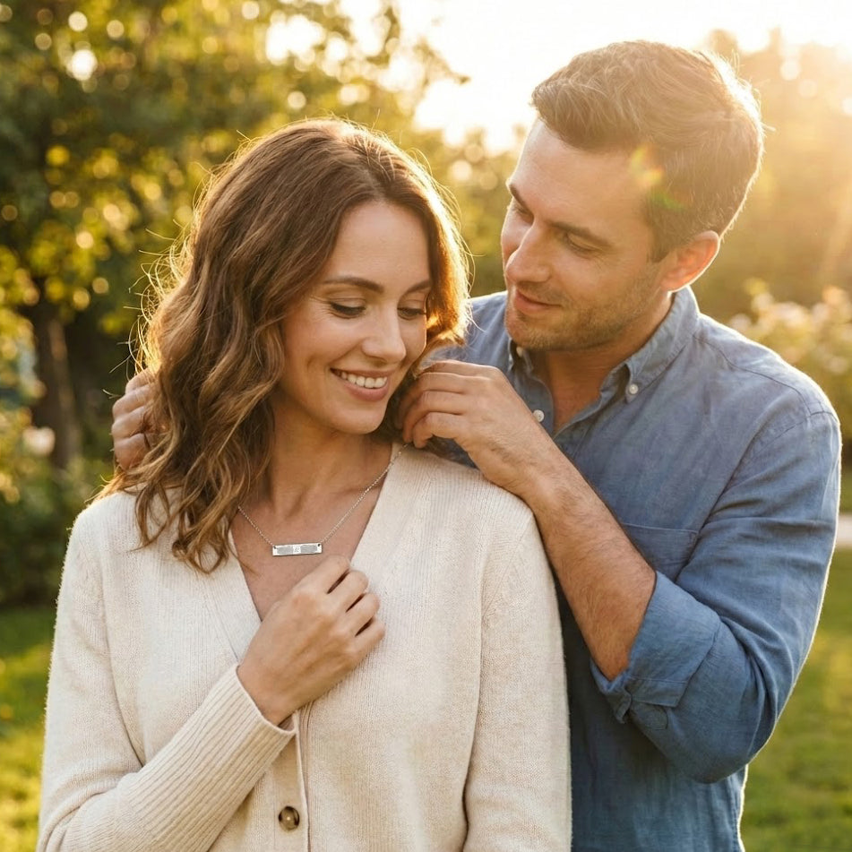 Couple sharing a meaningful moment wearing a personalized fingerprint bar necklace, sentimental jewelry gift symbolizing love and connection, custom engraved bar necklace for couples or anniversaries