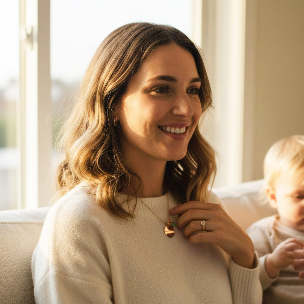 woman wearing personalized mama birthstone necklace with engraved disc pendant and three custom gemstones representing her children’s birth months, including amethyst, peridot, and clear quartz; meaningful mom necklace with optional child name engraving, handcrafted in 14k gold filled, rose gold filled, or sterling silver; perfect Christmas gift, holiday gift, Mother’s Day present, or sentimental keepsake for moms and grandmas
