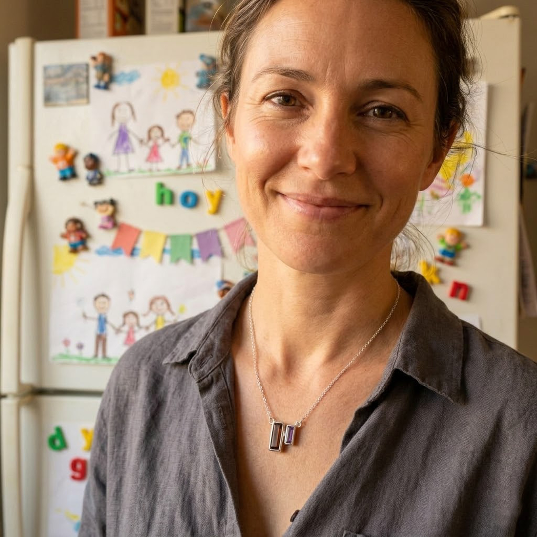 Celebrate your story with a custom mother’s birthstone necklace designed to represent the people who matter most. This elegant piece features a larger baguette-cut birthstone for mom, paired with smaller vertical birthstones symbolizing each child — creating a timeless and deeply personal family keepsake.