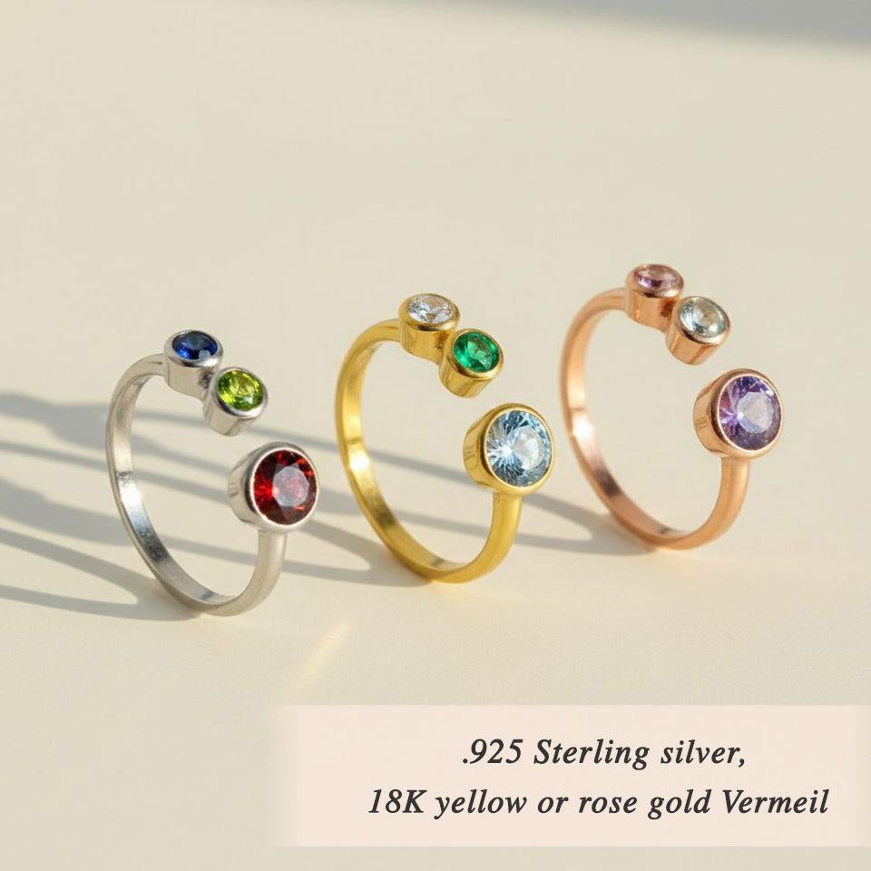 Celebrate your family with this multi birthstone ring for mom of two, featuring one large 5mm bezel-set stone for mom and two dainty 3mm stones for her children. This adjustable open ring is beautifully handcrafted and customizable with your choice of meaningful birthstones. A heartfelt and elegant gift for birthdays, Mother’s Day, holidays, or welcoming a new baby, it’s a timeless piece she’ll cherish every day.