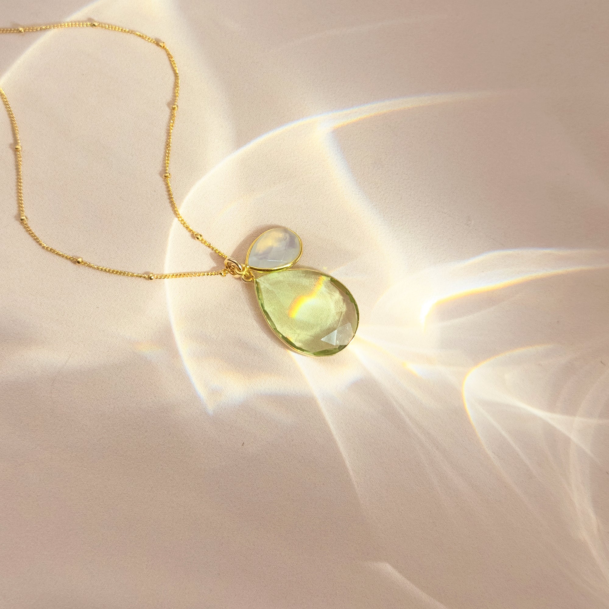 Custom birthstone mom necklace shown on model, featuring a dainty gold-filled chain with three bezel-set teardrop charms—a larger milky white center stone with aqua green and blush pink birthstones layered above. Personalized family necklace for moms with children’s birthstones; minimalist, everyday style that layers well. Elegant Mother’s Day, Christmas or birthday gift, handcrafted and gift-ready, customizable with additional stones or initials for a meaningful keepsake.