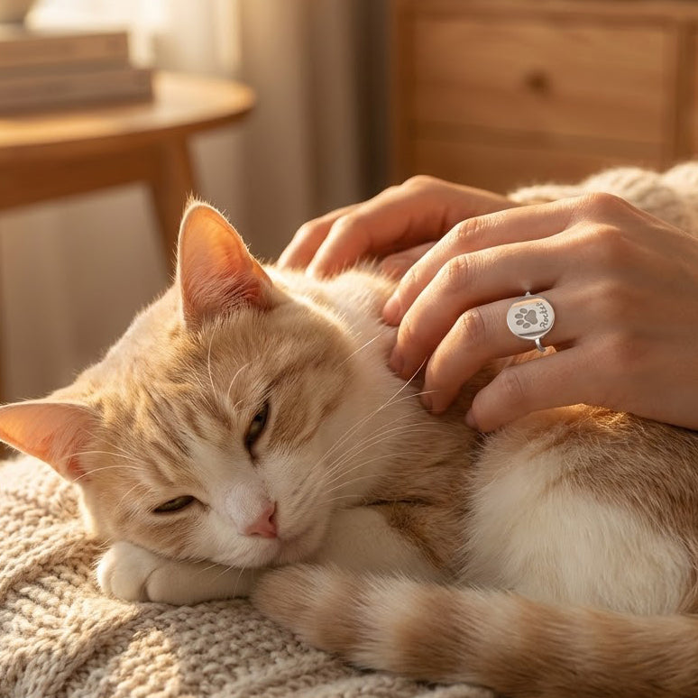 Cozy lifestyle scene of a woman sitting with her black dog, wearing her custom paw print ring as she pets their head, showing how the dainty engraved disc ring is an everyday reminder of her pup. Personalized pet memorial jewelry and dog mom gift idea, custom paw print ring that celebrates the bond with a beloved pet, ideal for birthdays, holidays or remembrance.